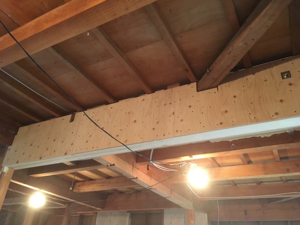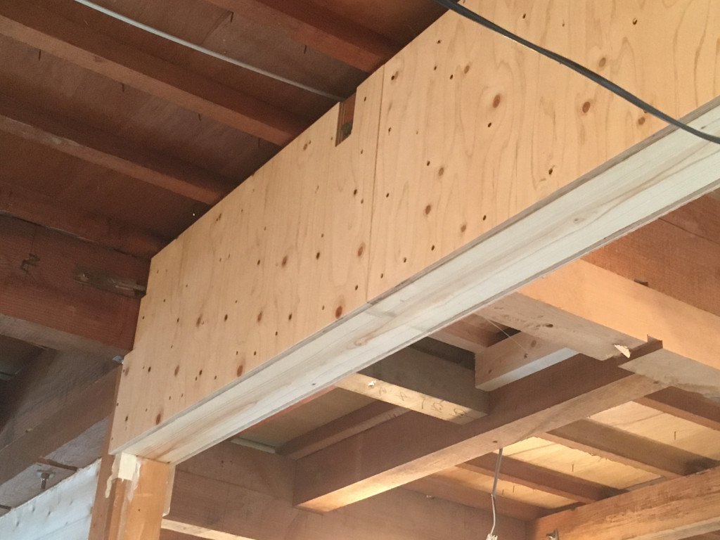 既存の梁の下に補強部材を入れて、構造用合板で挟み込む事で、