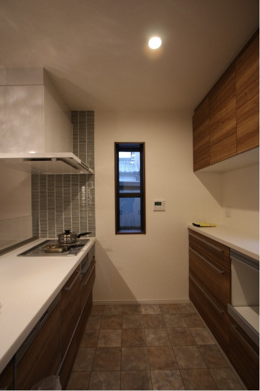 こちらのキッチンはコンロ前の壁も床も本物のタイル