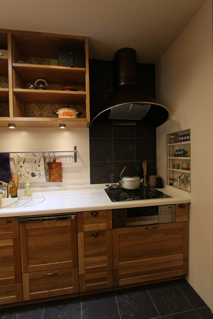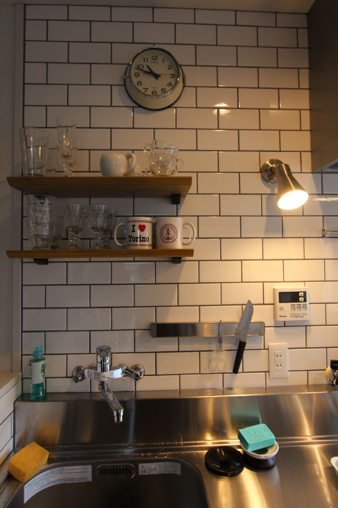 このキッチン、コンロ横は本物のタイルで、床はビニール素材のタイル柄です。