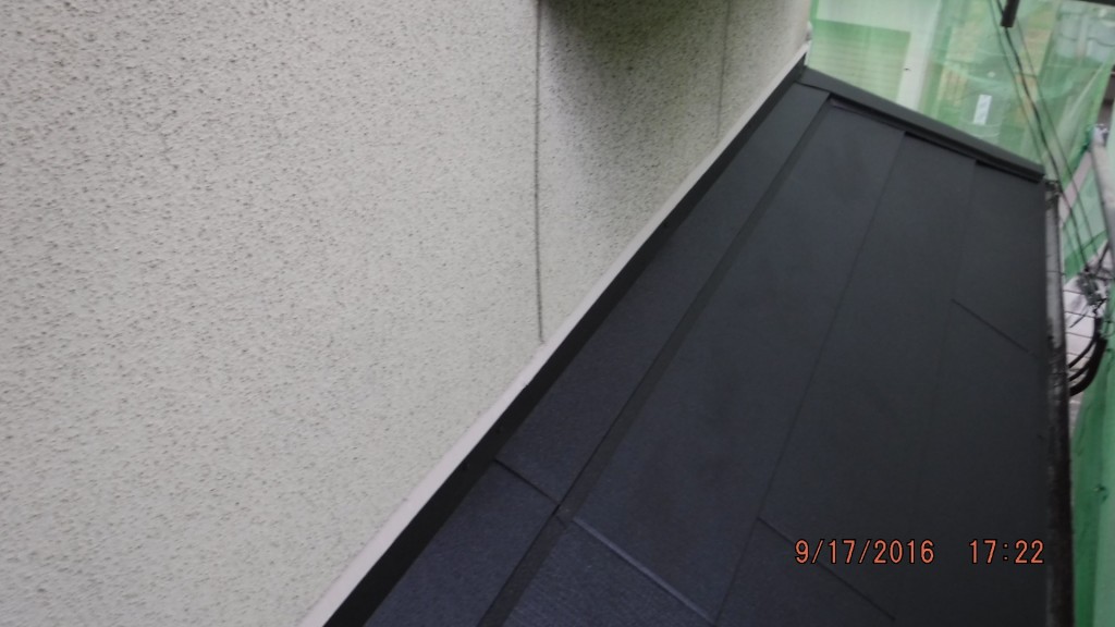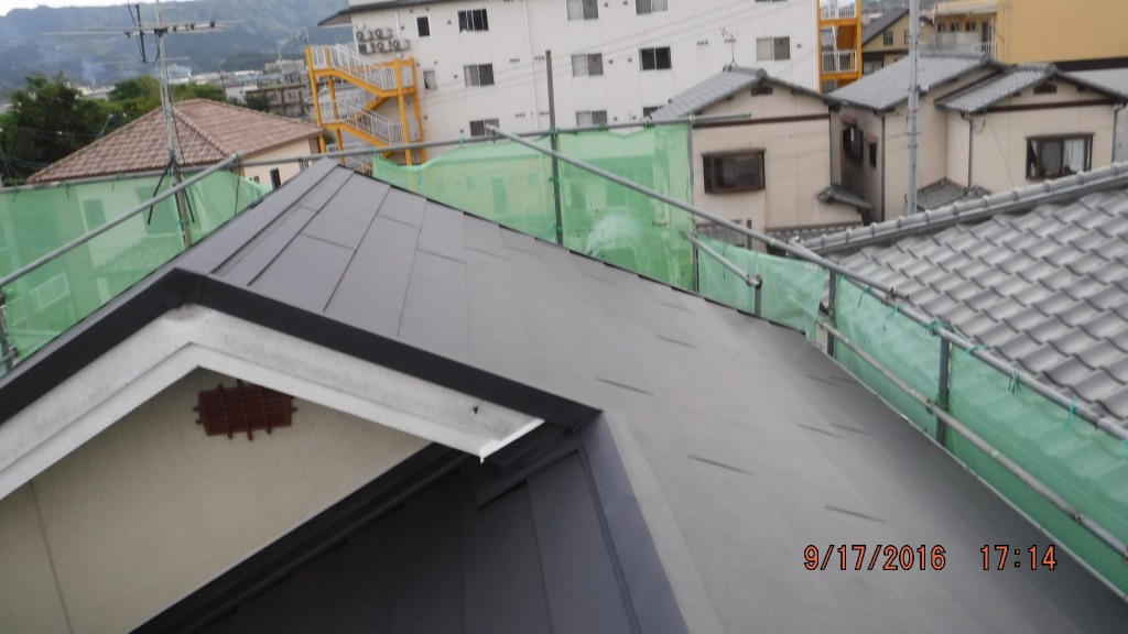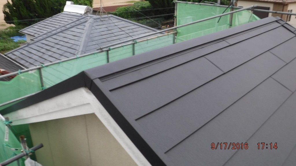 ガルテクト(ガルバリウム鋼板製の薄い屋根材)を貼り上げていく施工方法です