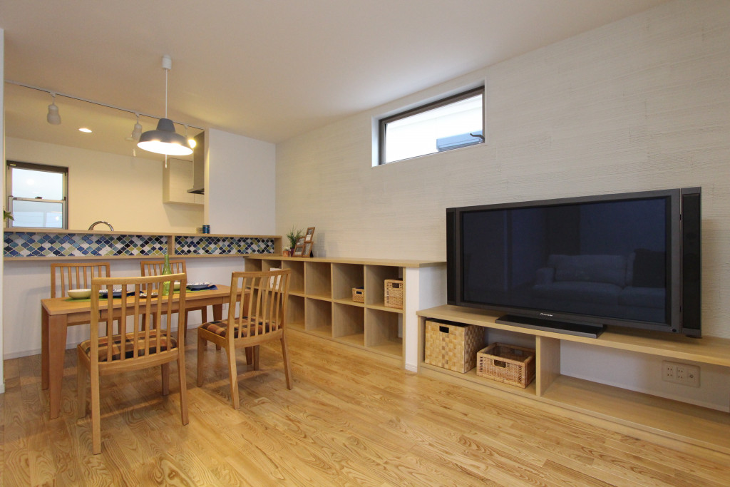 TV台からオープン棚、キッチンの腰壁と少しづつ高さを上げていく事で