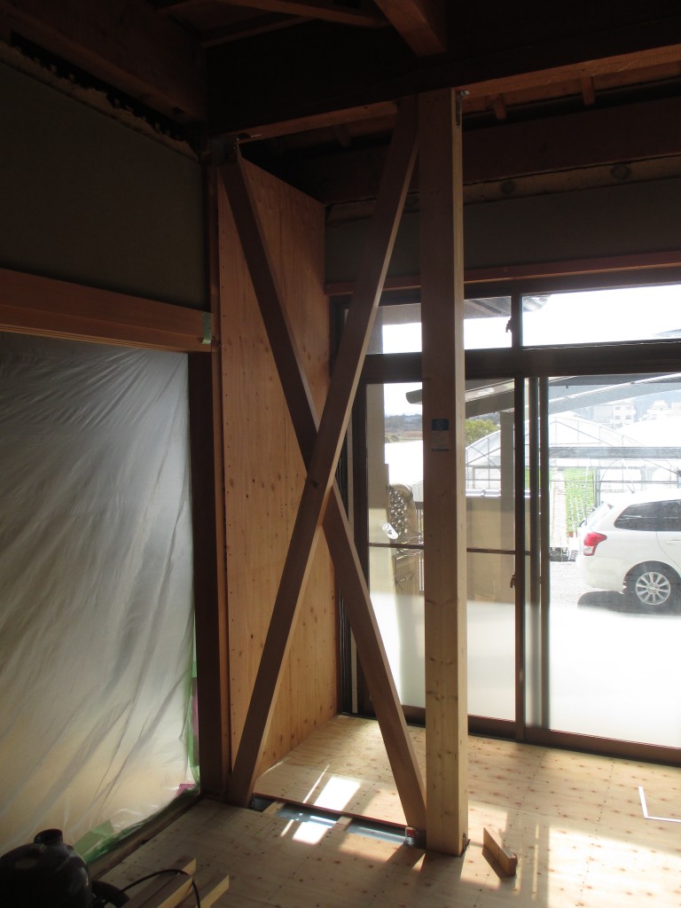 台風や地震によってお家が歪むのを筋違いを入れてあげる事により、