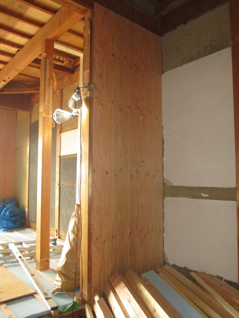写真のような構造体から構造体までを構造用合板で固定する方法もあります。