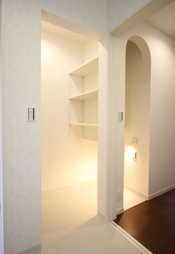 写真右:廊下(濃い色のフローリング)のアーチ部の