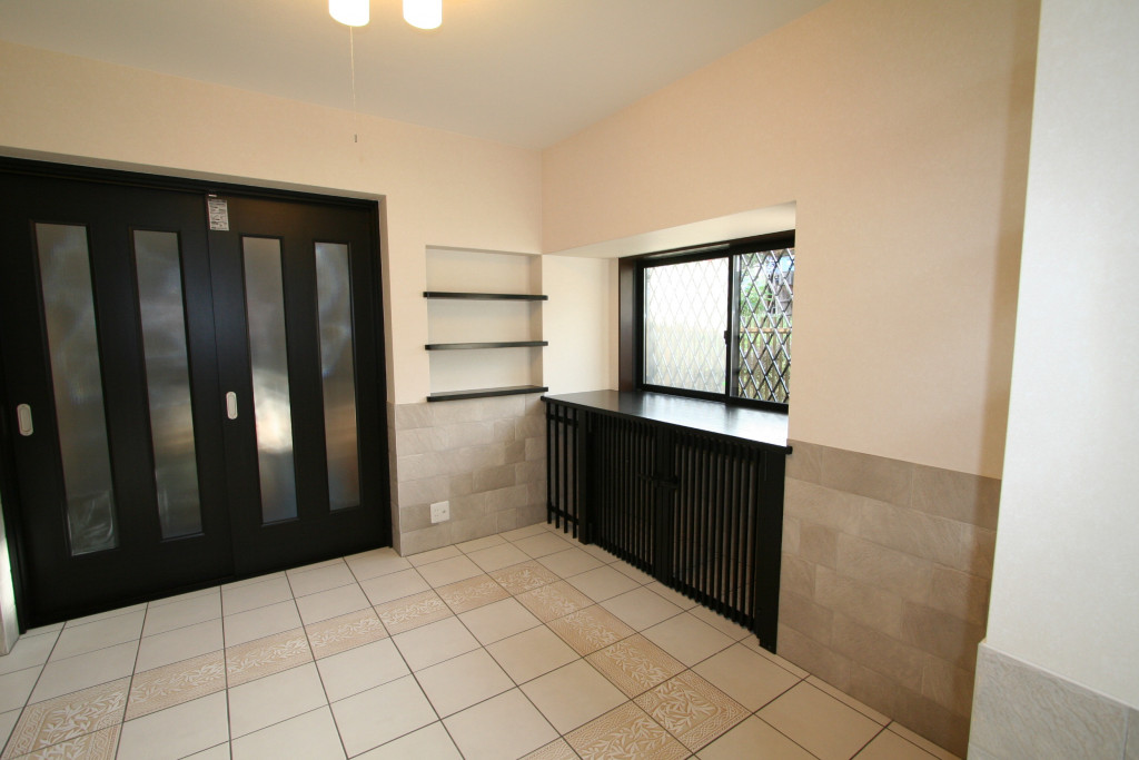 ペット達には最適です。腰壁部分はめくれや傷に配慮して調湿消臭機能のあるタイルにしています。