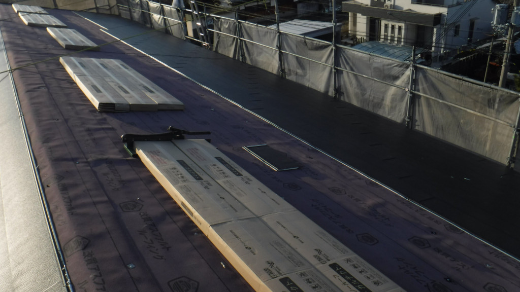 その上に軒先から金属瓦を葺いていきます。現在はガルバリウム鋼板