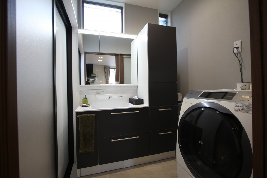 大容量の収納を兼ね備えた洗面台にし、また壁上部にも窓を設けて、陽の光あふれる空間に。