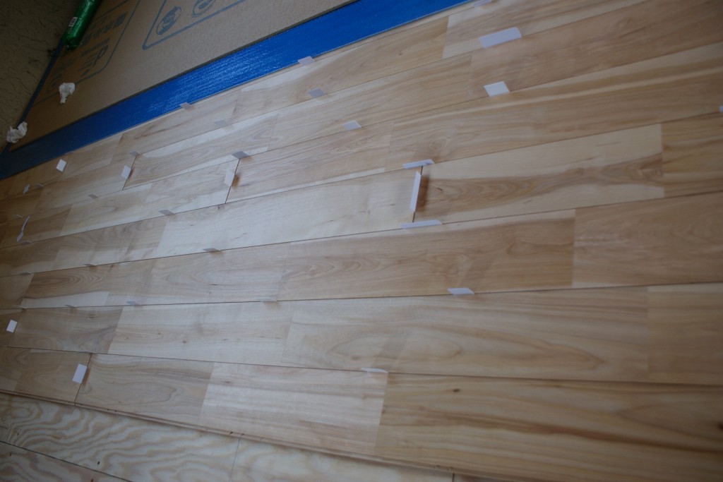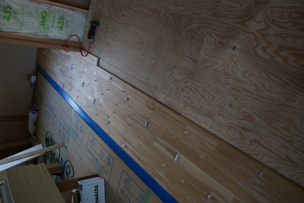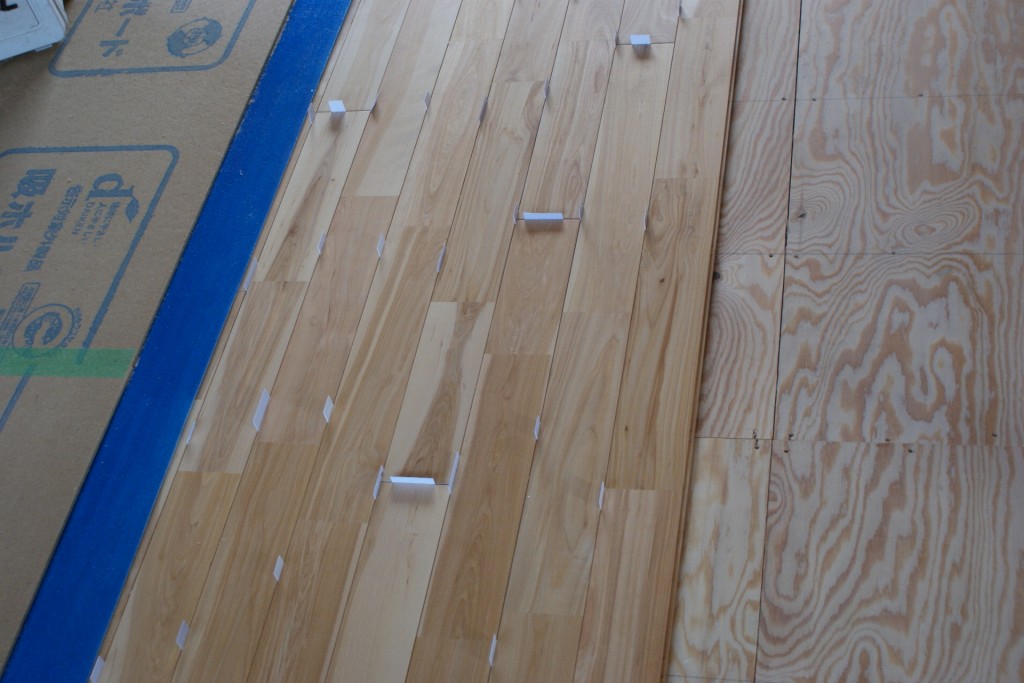 必ず無垢材のフローリングの施工時には、必ず捨て貼りの合板(12ミリ)を使用し