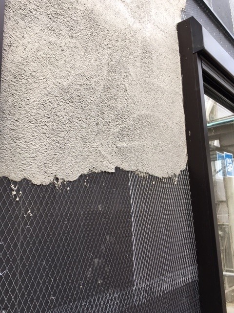 今回は外壁の正面と裏面のモルタルを捲り、新しいモルタル+塗装で仕上げていきます