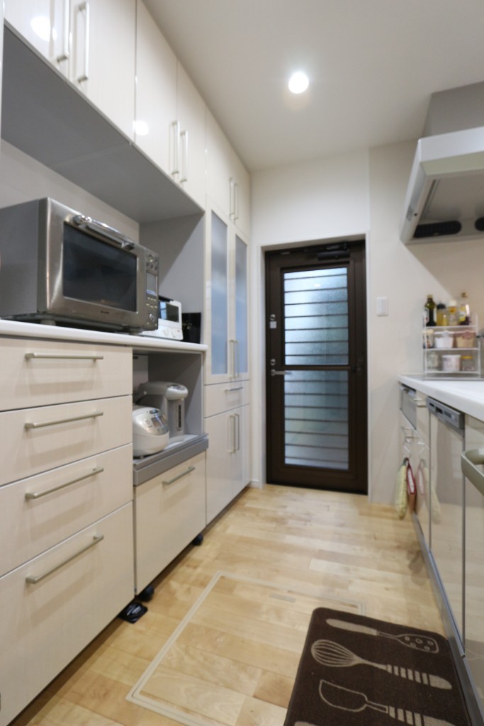 カップボードは収納と家電が置けるようになり家事動線もよくなりました。