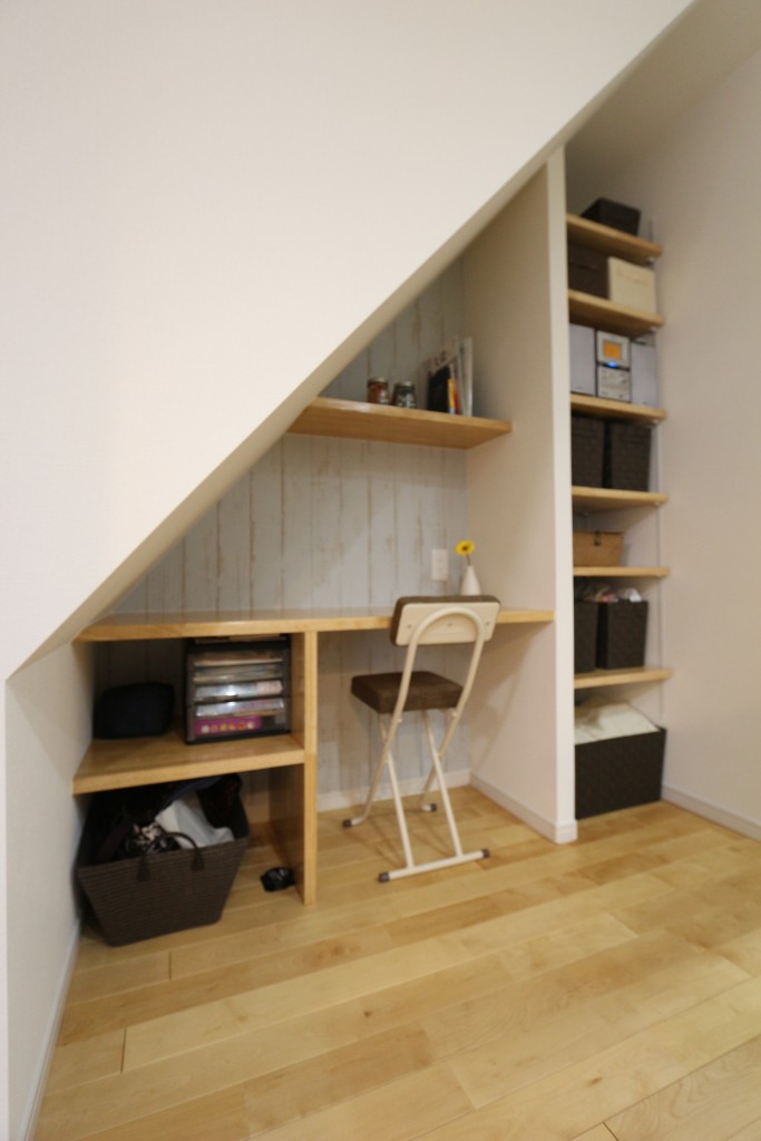 △以前は使いづらかった階段下収納を奥様の家事コーナーに。