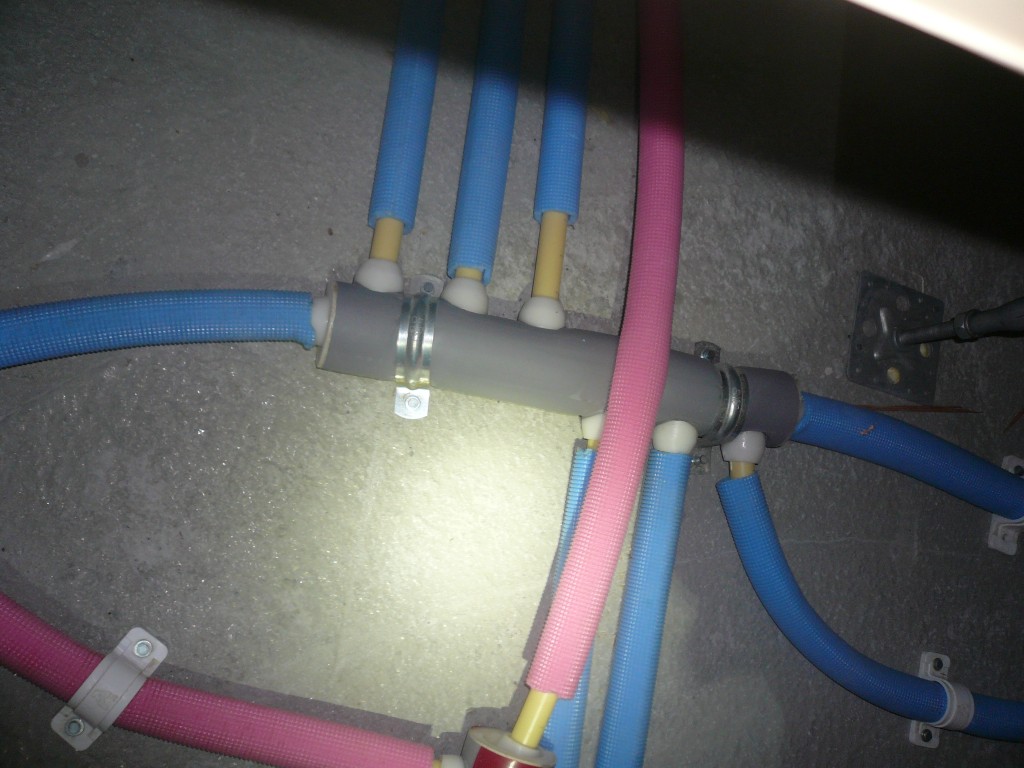 一本の配管からそれぞれの各設備機器(浴室・洗面所・トイレ・キッチン・給湯器)へ分岐しています。