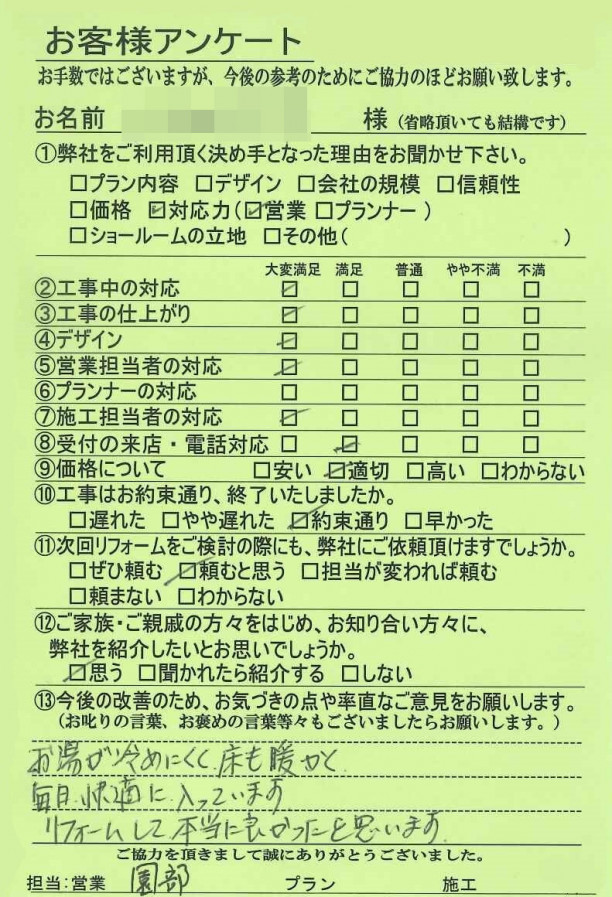 お湯が冷めにくく、床も暖かく 毎日快適に入っています。 リフォームしてよかったと思います。