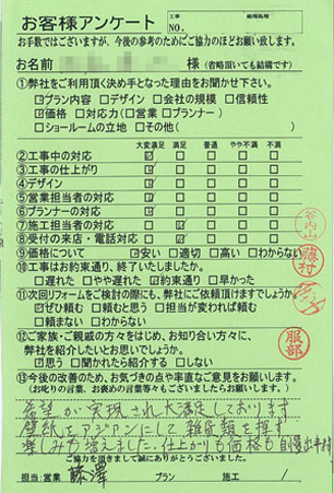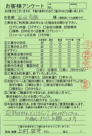 奈良橿原ショールームで工事をさせていただいたお客様から、いただいた「アンケートはがき」からのご意見やご感想をご紹介いたします。