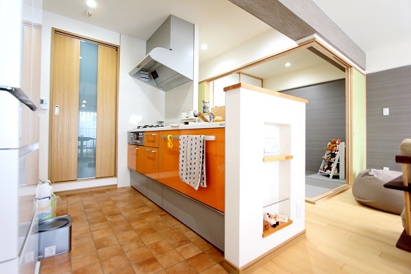 マイホームにこだわりを入れたいとご希望だった奥様。テラコッタ調の床材とオレンジのキッチンは奥様セレクト。対面キッチンにしたことでご家族との会話を楽しみながら料理をすることができます。