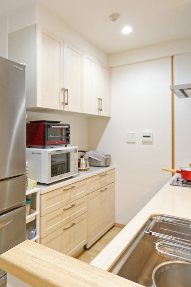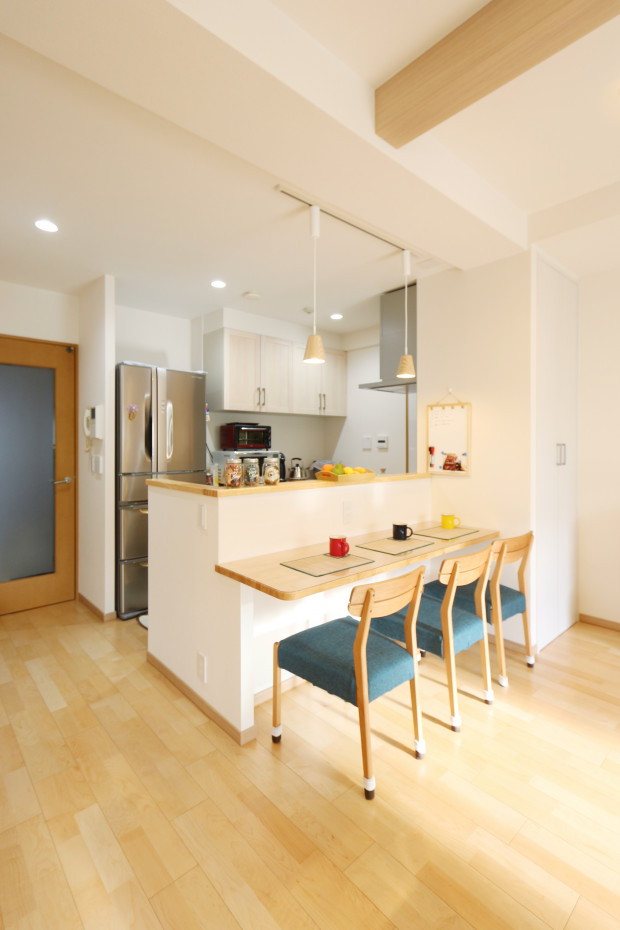 吊戸棚を無くし、キッチンは既存を再利用。お悩みだった圧迫感を解消したオープンなスペースに。キッチン前は、お手入れがしやすいキッチンパネルで仕上げました。