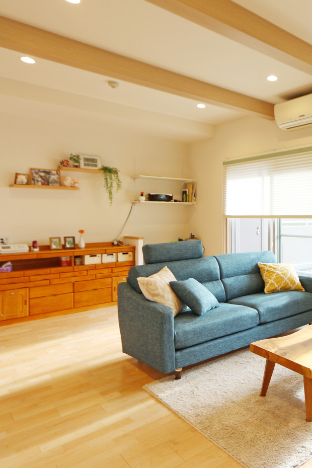 天井を目一杯高く取り、ご主人様ご希望の化粧梁を造作。また、日差しを調節できるように、窓には遮光範囲を調整できるブラインドをご提案しました。