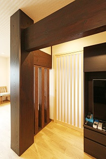 玄関扉の上部には明るさを取り込む欄間を造作。和の雰囲気を残すように、梁や柱の色に合わせて濃い色の玄関収納を新設しました。(写真左)