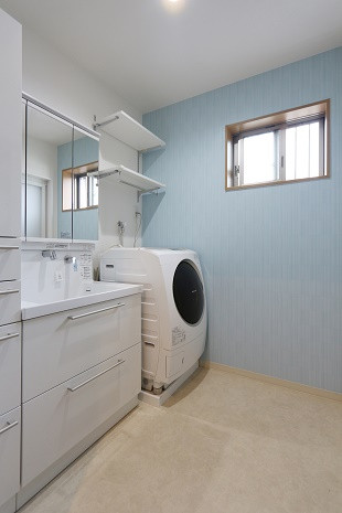 洗濯機の上には棚を取り付け、収納も完備。