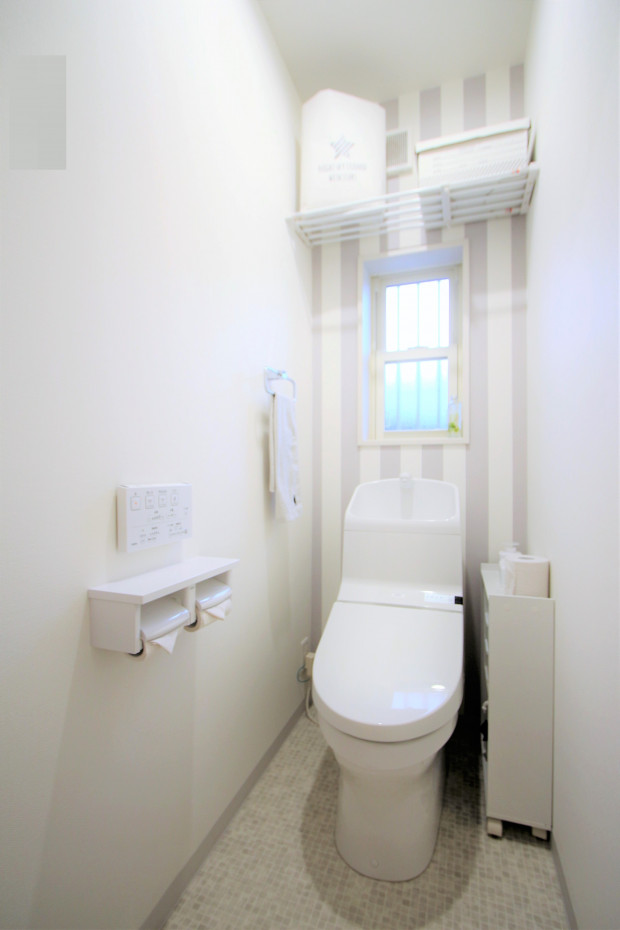 白とグレーでまとめたシンプルなトイレ。ストライプのアクセントクロスがこだわりです。