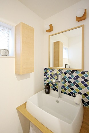 頭も洗えるように深さにこだわり、蛇口も背の高いものをご提案。カラフルなタイルがポイントです。