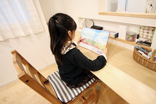 壁にカウンターを造作し、お子様の勉強スペースに。家事をしながら、お子様も見守れる空間です。ご家族の写真やお子様の作品も飾っていただけます。