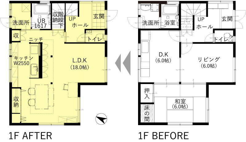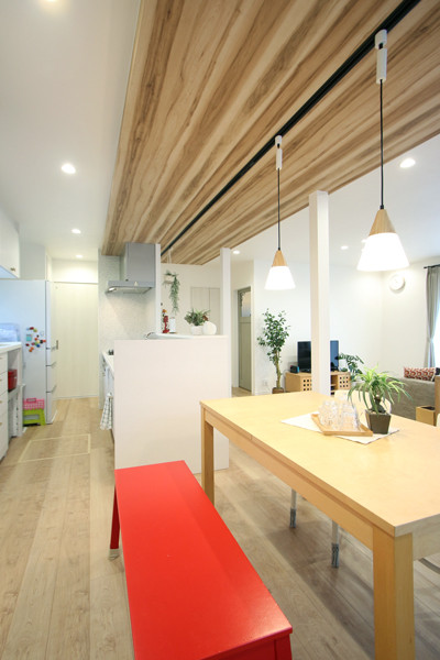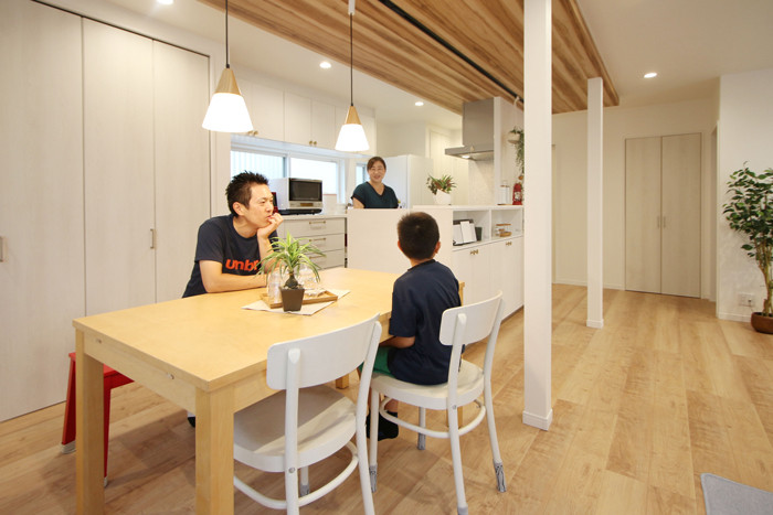 元々のダイニングキッチン、リビング、和室の3部屋をひと続きにして、約18帖の開放的なLDKに!段差もなくなりバリアフリーを実現。家族と話しながら、料理を楽しめるようになりました。