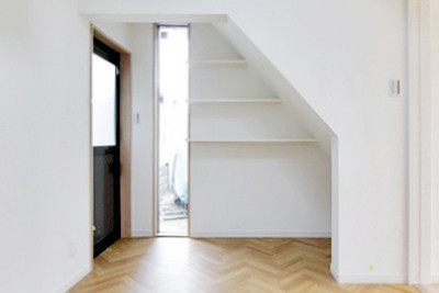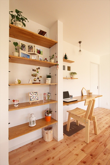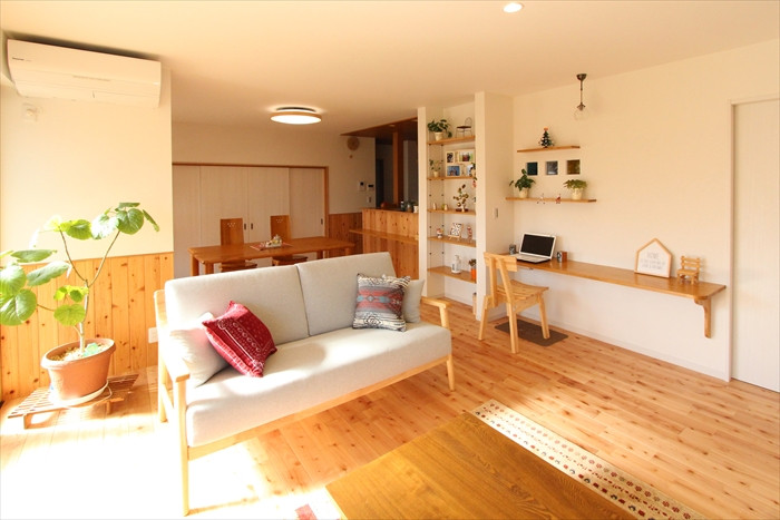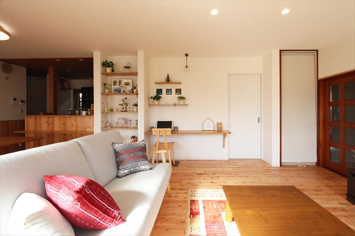 LDKの一角には、可動収納棚とPCスペースを造作。