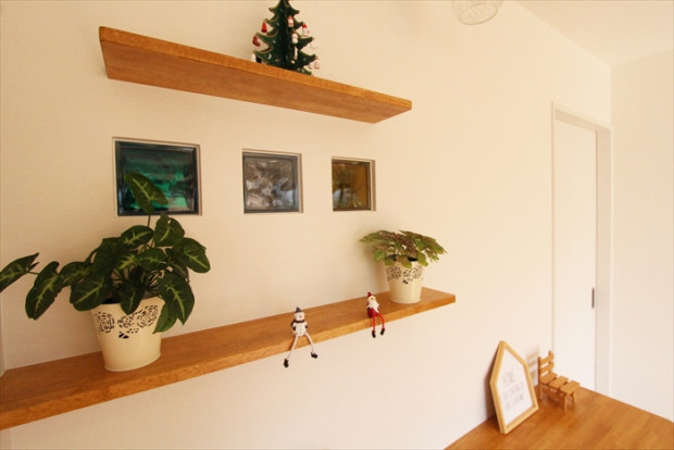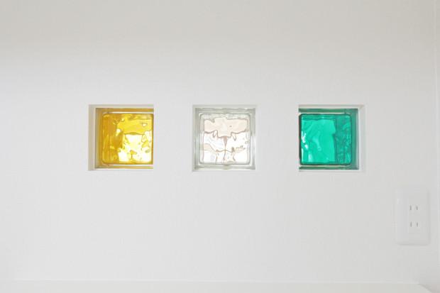 飾り棚の下には3色のガラスブロックをはめ込みました。