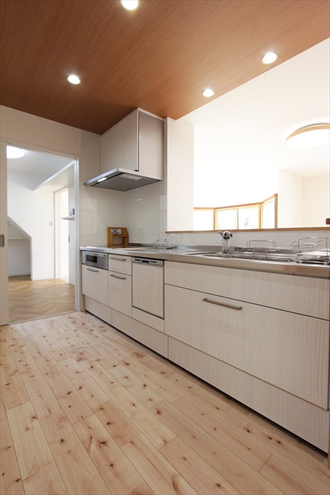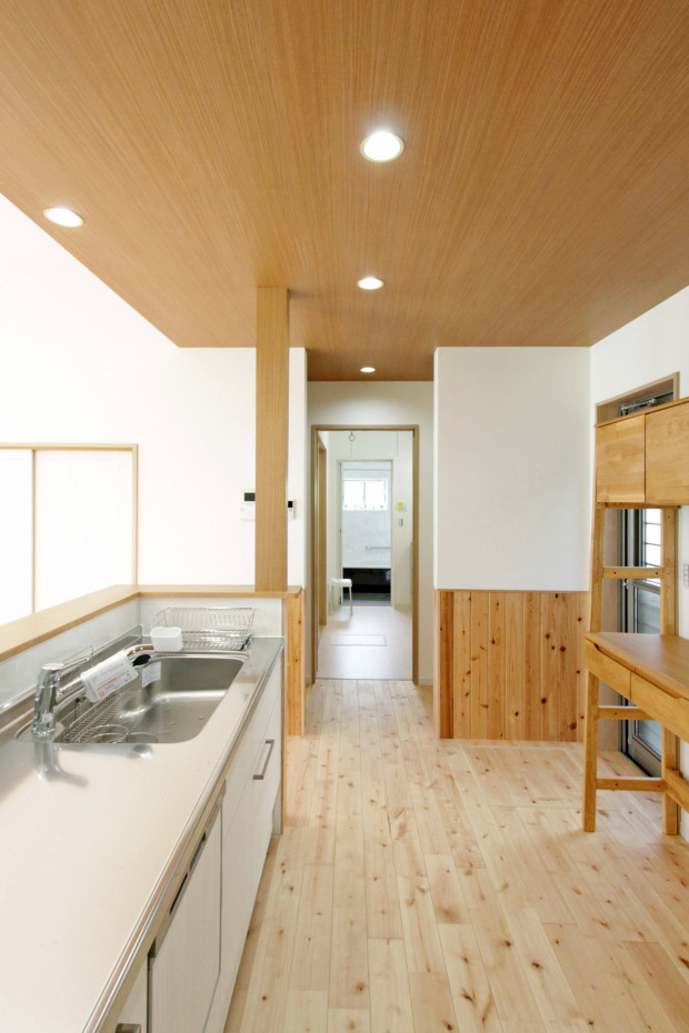 【キッチン】キッチン前の腰壁には羽目板、天井には木目クロスを貼ることで、木のぬくもりを感じるキッチンになりました。