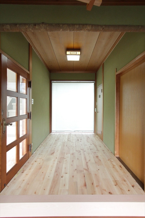 【玄関・ホール】LDKと同じ無垢フローリングを施工し、垂れ壁や既存の和の雰囲気を活かした明るい空間に仕上がりました。