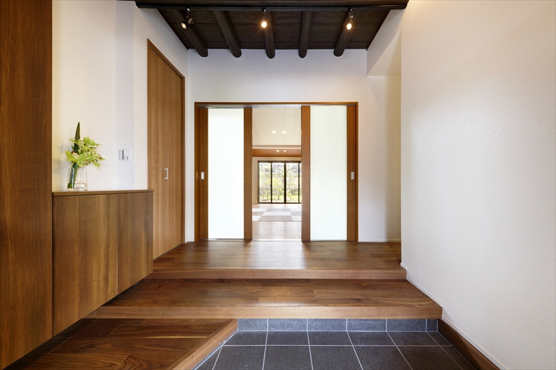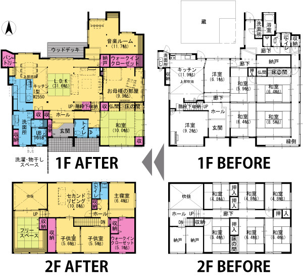 ■施工内容 /キッチン:トクラス ベリー I型W2550/UB:TOTO サザナ 1618サイズ/洗面化粧台:[1F]トクラス アフェット W1200、[2F]造作(洗面ボウル:サンワカンパニー)/トイレ:[1F]TOTO ネオレスト、[2F]TOTO HV /床:無垢複合フローリング(LDK・お母様の部屋・ウォークインクローゼット・ホール)、表面加工無垢フローリング(寝室)、クッションフロア、畳(LDK・和室・フリースペース)、タイル(玄関)/壁:クロス、じゅらく(和室)、シナベニヤ(音楽ルーム)、珪藻土(セカンドリビング)一部エコカラット(LDK、寝室、洗面所、トイレ)/天井:クロス、シナベニヤ(音楽ルーム)/カウンター、収納、棚、床の間、仏間、造作/建具、サッシ新調/階段架け替え/床暖房/ウッドデッキ/外壁塗装/外構工事/