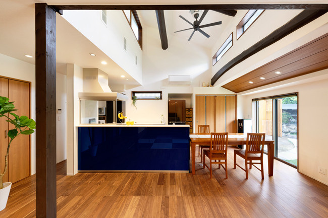 【LDK】吹き抜け・お庭につながる窓を大きく設け、明るく開放的な「家族みんなが集まれるLDK」に。