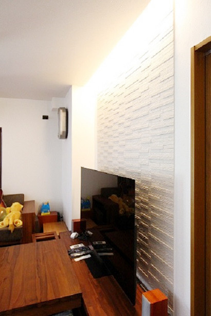 テレビ背面壁にはエコカラットを採用。上から間接照明でほんのりと照らしました。