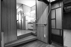 左には、洗面所から直接アクセスできる洗濯・物干しスペースの目隠しとして格子を取り付けました。