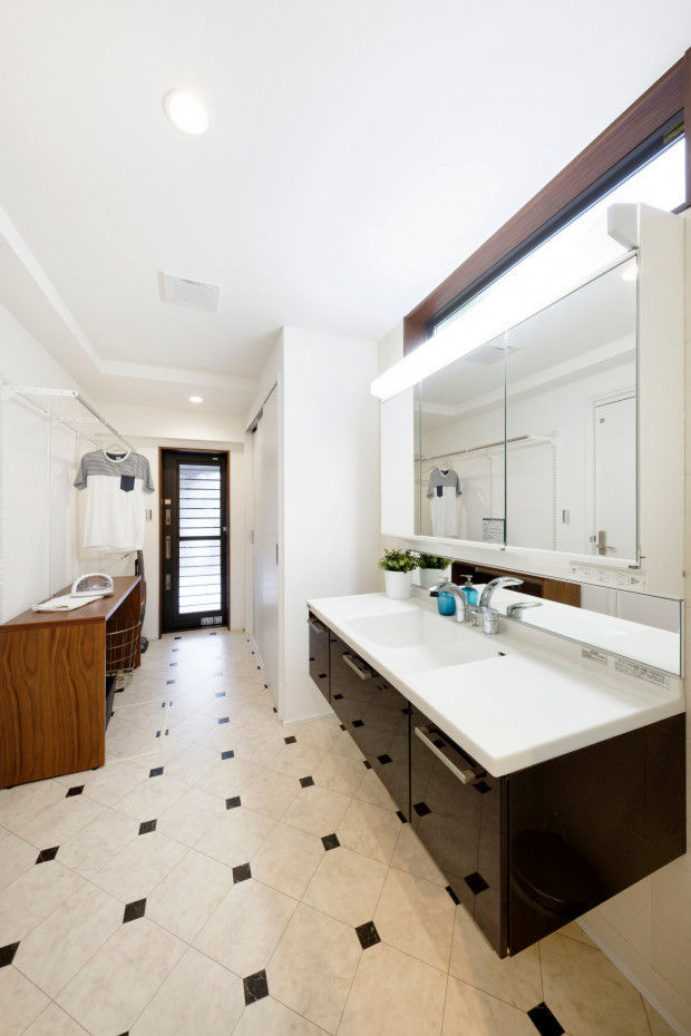 広々とした洗面所内には、室内で洗濯物を干せるスペースと、カウンター、収納を設置。