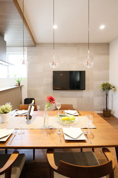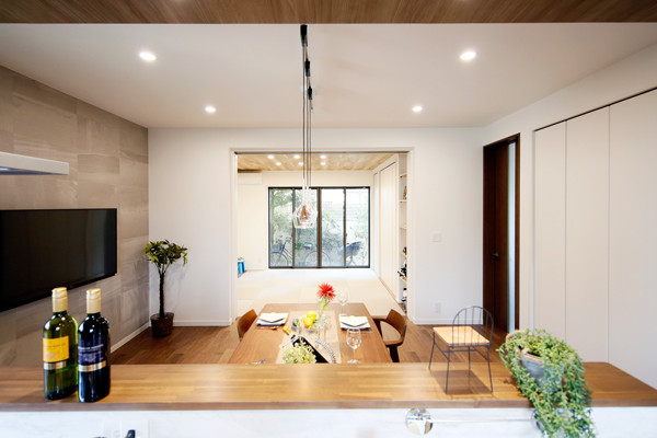 【LDK】ダイニングとキッチンを主役にした間取りに!これまであった窓を活かして採光性にこだわり、上げ下ろしが簡単にできる電動シャッターを取り入れました。