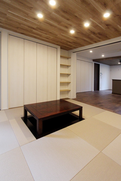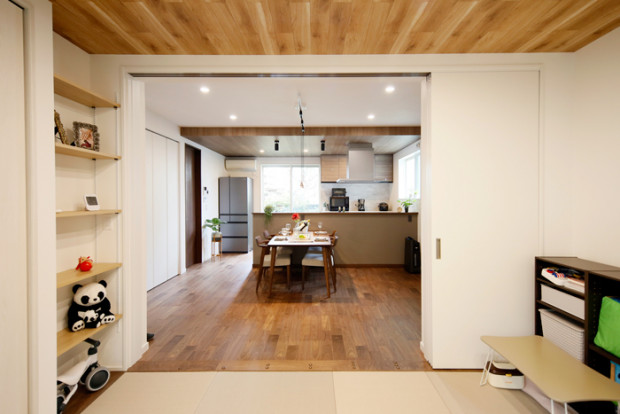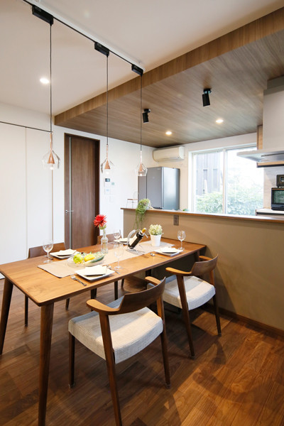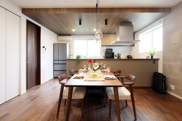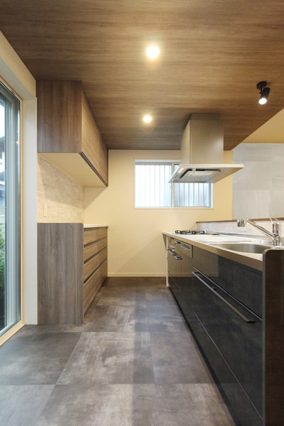 キッチンの天井はあえて少し低くして、木目調のクロスをアクセントに。