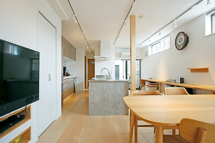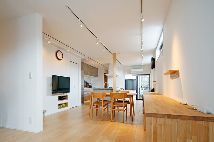 TV下にニッチを造作し、歩行の妨げになるような家具を置かずスッキリ!