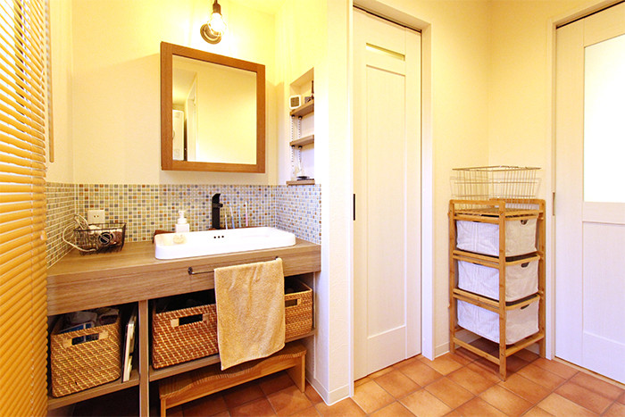 洗面台は収納量と、デザイン性を考えて造作洗面をご提案しました。