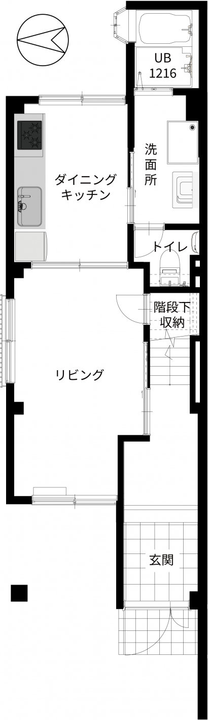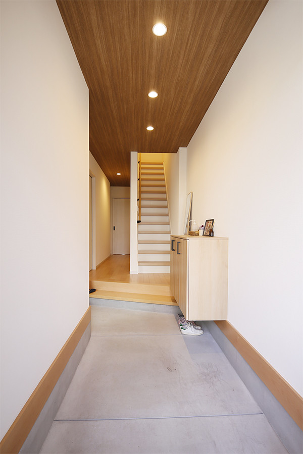 土間スペースと階段前のホールを広くとるため、奥行を広く見せるよう框を斜めに施工しました。