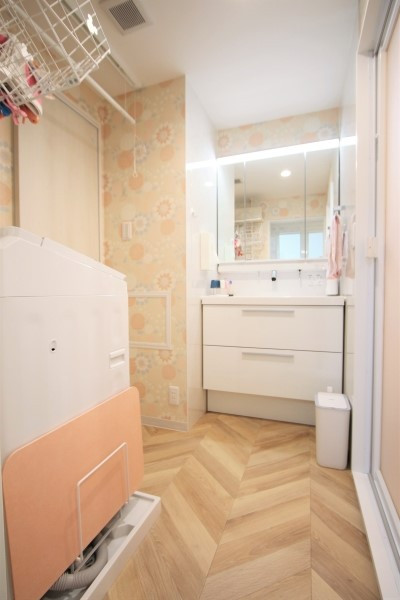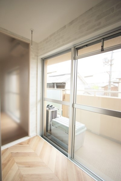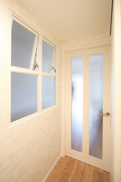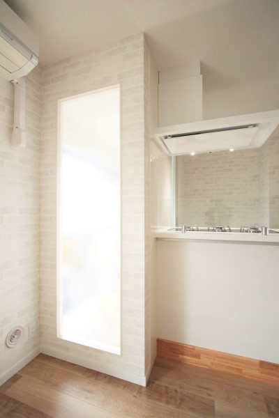 洗面所→キッチン→物干しスペースまでの動線もスムーズに。アクリルのFIX窓を設置することで明るさも確保しました。