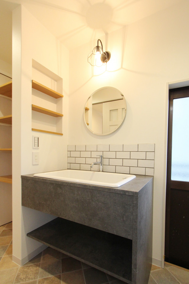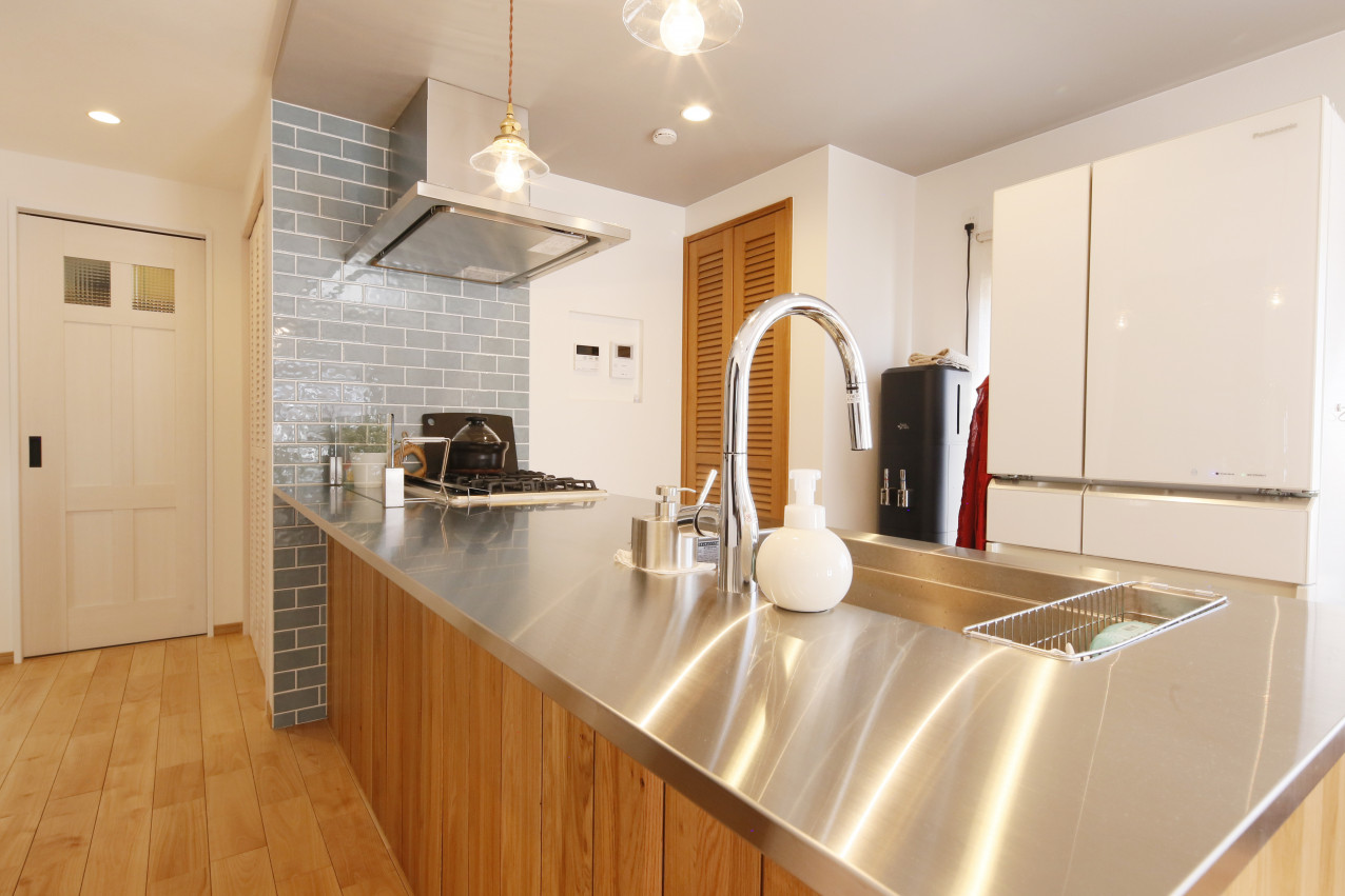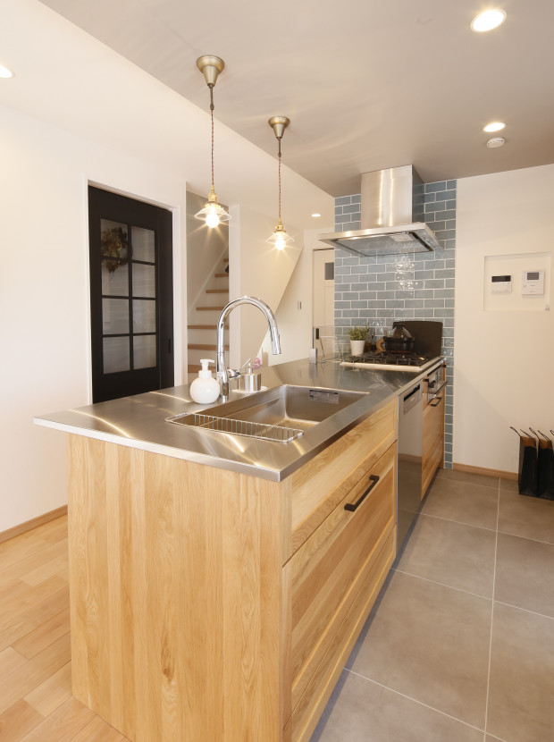 奥様憧れの無垢キッチンに!床はフロアタイルで壁には造作洗面台のタイルと色違いのブルーを使用することで統一感を出しました。