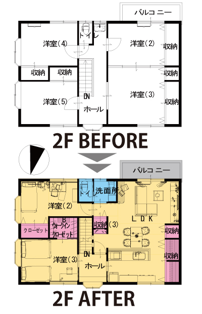 両親と同居されるのをきっかけに、N様ご家族のLDKを2階につくれたらという事で相談に来られたN様。他にも子供が安心して暮らせ、スペースの中で広々と過ごせるよう収納を充実させたいということでした。