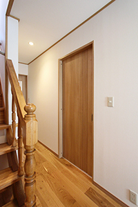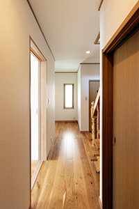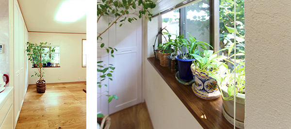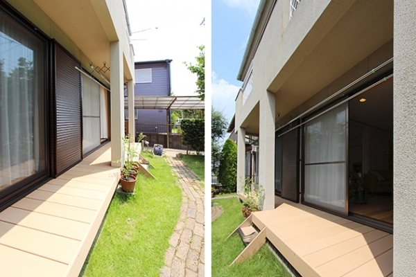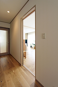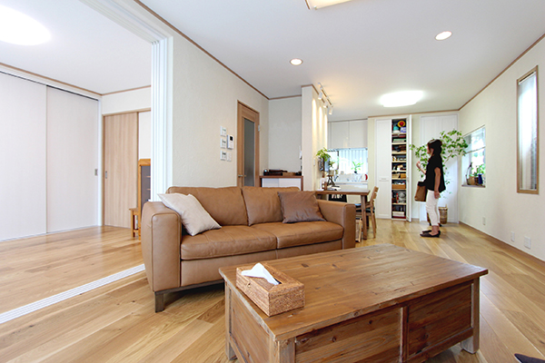 床は床暖房対応の無垢フローリングを、壁は調湿効果のある珪藻土をご提案。冬場の床の冷たさも改善し、ナチュラルな雰囲気の空間にしました。また、LDKの続きでウッドデッキを設置し、背の高い扉にすることで広がりのあるLDKに。