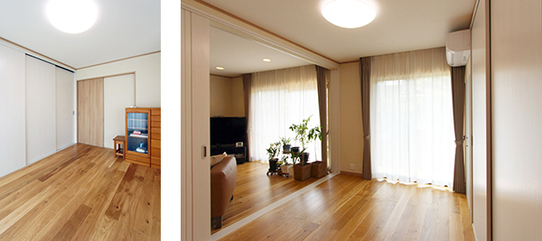 和室の壁は撤去し、3枚引き込み扉に。床の段差も無くし、光と風がリビングに多く入る明るい空間にしました。扉を壁面と同系色のホワイトにすることで圧迫感を軽減させました。