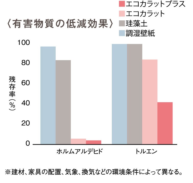 【調湿作用】有害物質をすって、クリーンな空気を出します。 エコカラットプラスは、家具や他の建材から揮発していき、シックハウス症候群の原因ともなる有害物質(ホルムアルデヒド、トルエンなど)を吸着し、空気中の濃度を軽減する。もちろんエコカラットプラスの原料には、これらの有害物質は使われていない。