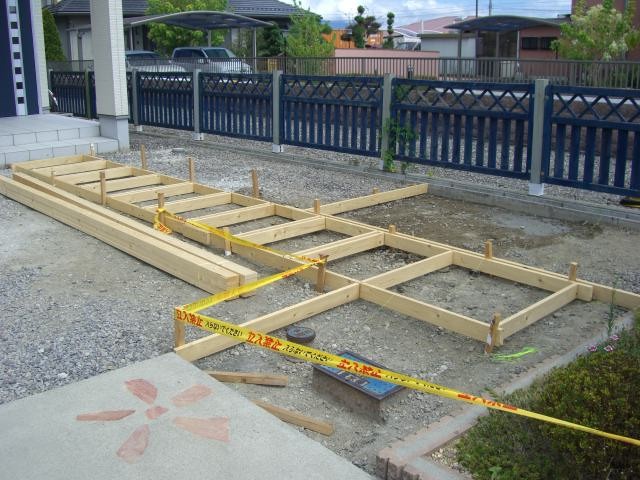 踏み石部分にコンクリートを流すため型枠で囲います。