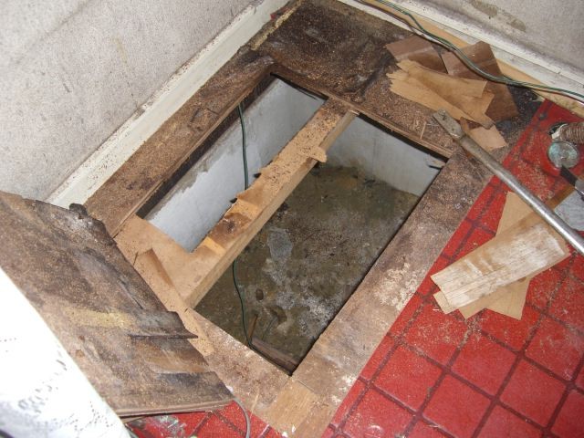 洗濯機の底が水漏れしていたみたいで長期間湿気ていたようです。床板をめくると下地材は無事の様子