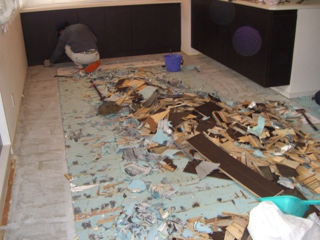 板材をめくります。防音用のクッションがコンクリートとしっかり付いています。